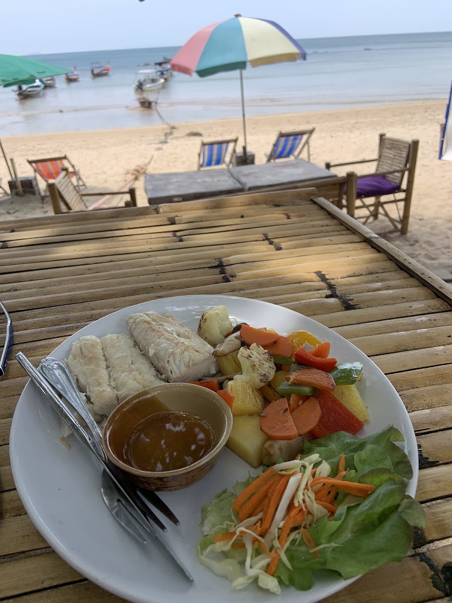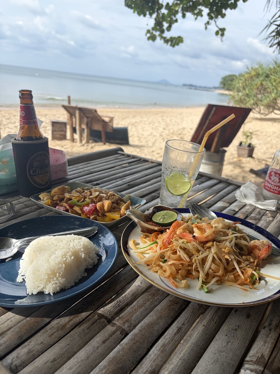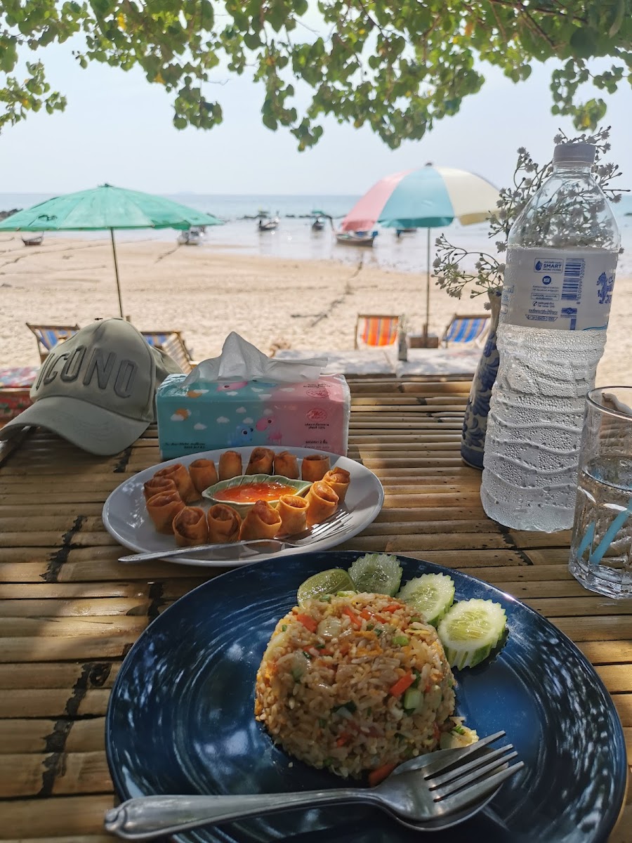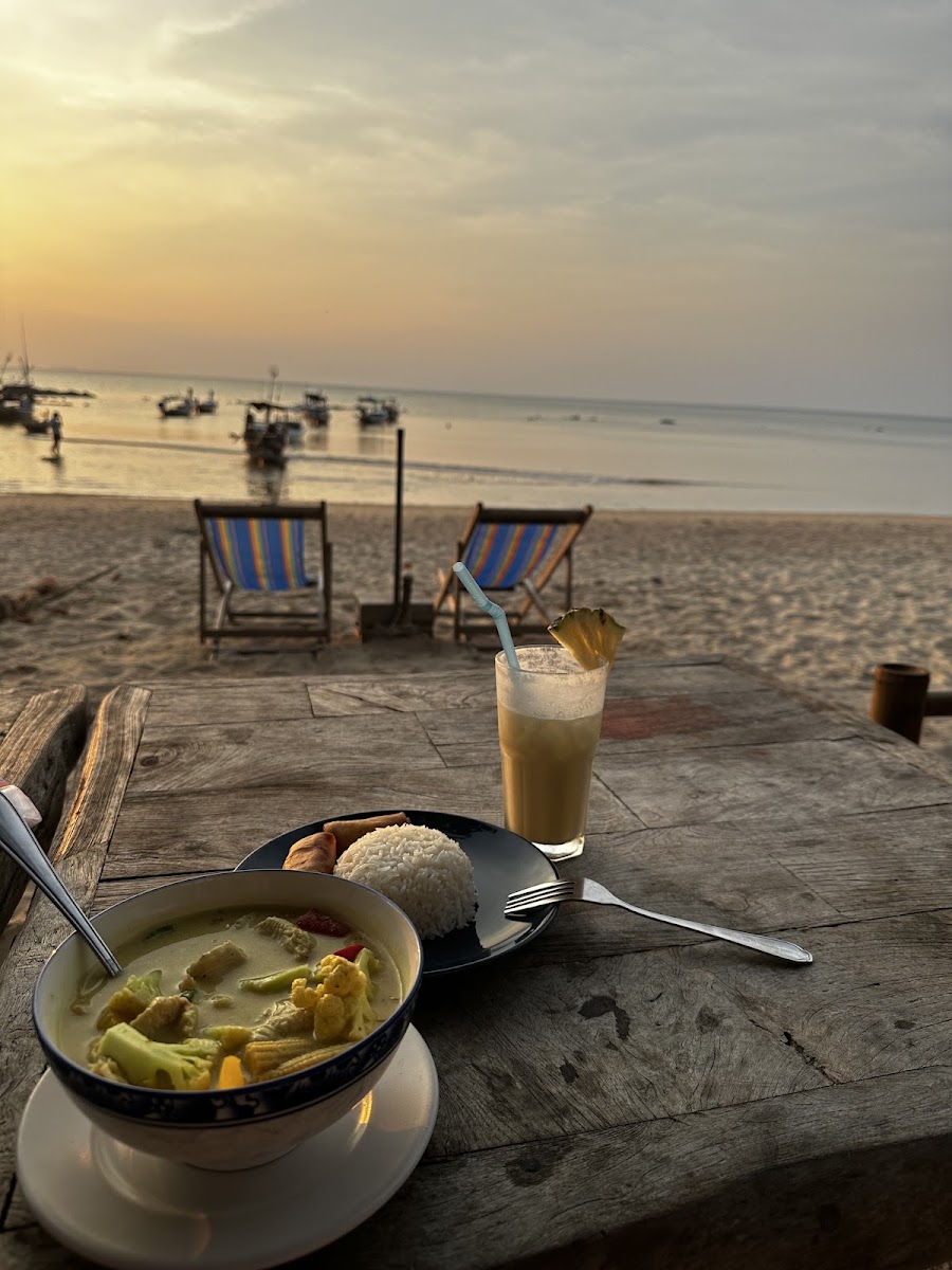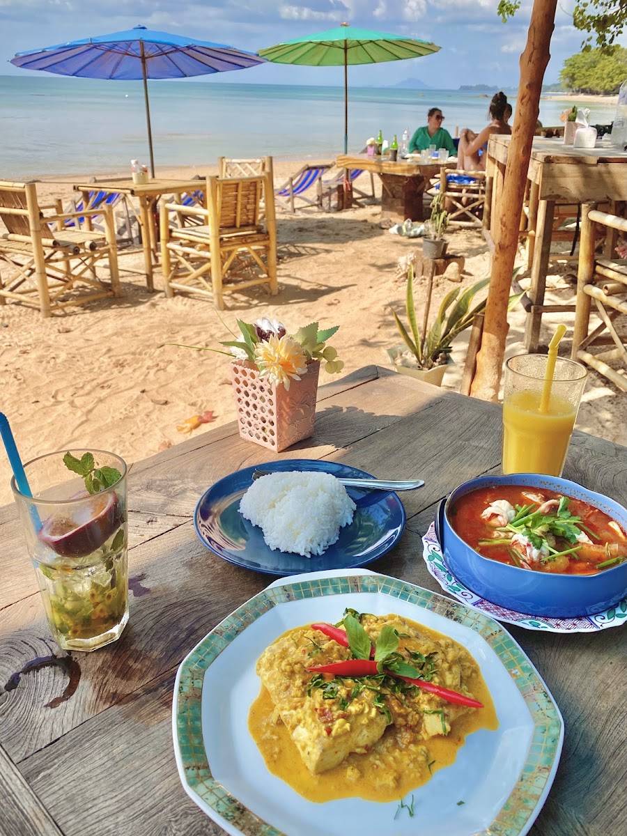 Best food I've had in Thailand. The owner puts heart and soul into this place as you can tell by his personal note in the front of the menu, apologising that the place might not be as it was pre-covid. And that he's rebuilding his dream. The view amazing is at the end of the beach, right on the cove. Tables and deck chairs on the beach, looking over to a few long boats on the bay. I had the baracuda in dry red curry and it was divine. Definitely come here. It's easy to get to, just off the main road, down to the beach.